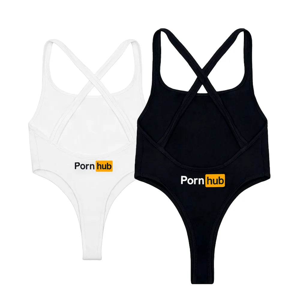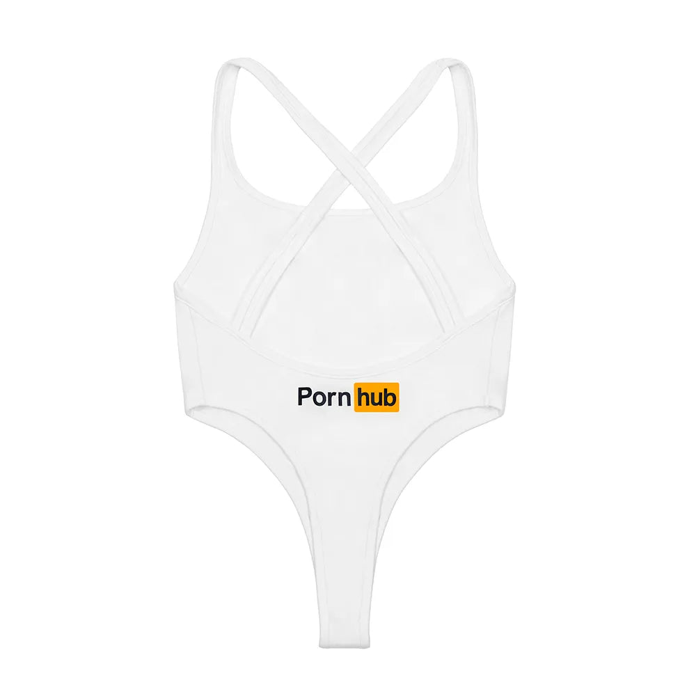 Pornhub’s White Thong Bodysuit is made of a soft cotton/spandex blend that hugs every curve with a crisscross back and scoop neck. Our black and orange logo is featured on the front and lower back, so coming or going you will turn heads.